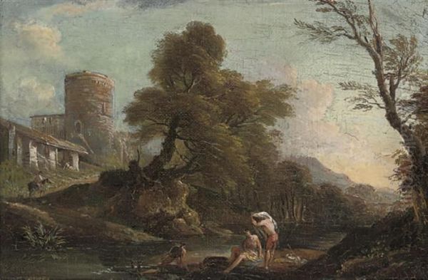 A Wooded River Landscape With Bathers On A Bank, A Fortified Townbeyond