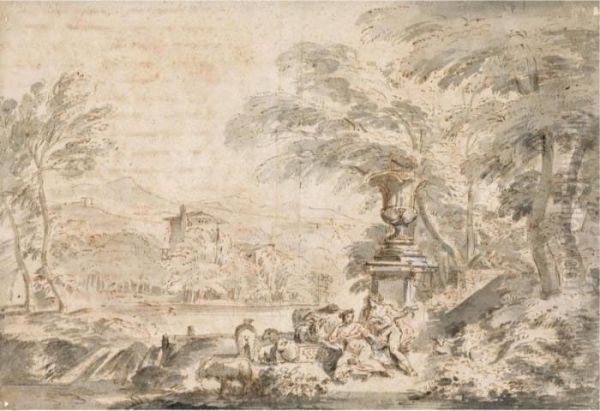 A Youth Serenading A Shepherdess In An Ornamental Garden, A Landscape Beyond