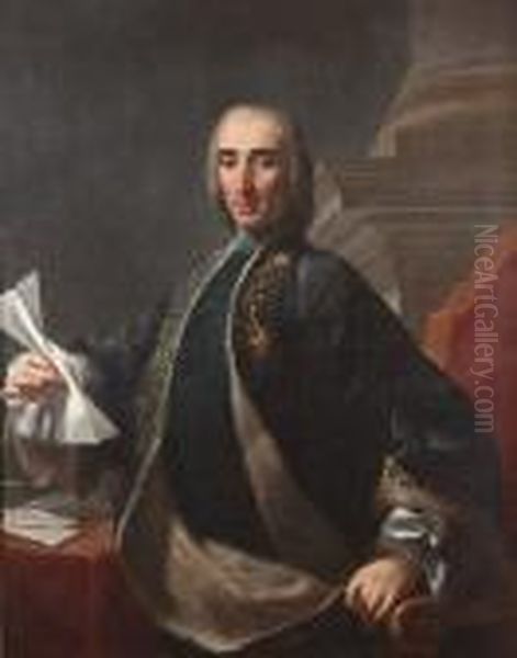 Portrait Of A Gentleman, Seated Half-length, At A Table, In A Dark Blue Ermine-trimmed Coat, Holding A Letter, Before A Column
