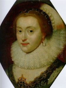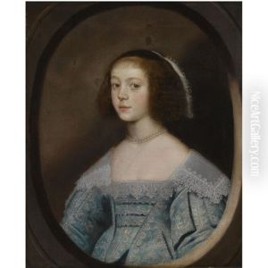 Portrait Of A Lady, Half-length, In A Richly Embroidered, High-necked White Dress With Pink Trim, A Jewelled Headdress And Pearl Necklace, Seated Holding Gloves In Her Left Hand