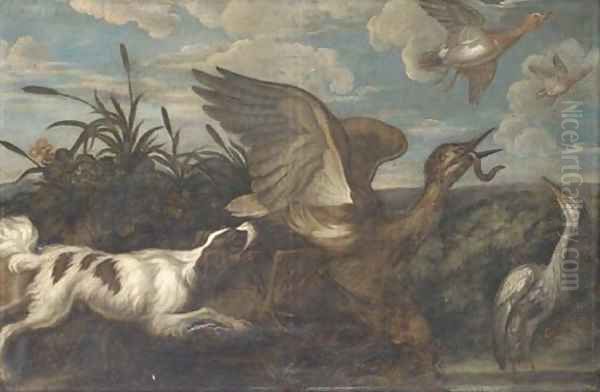 A spaniel chasing a bittern, with a heron and duck, in a landscape