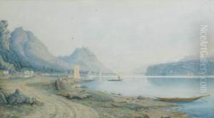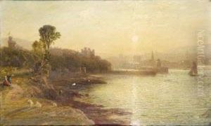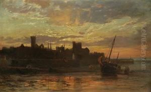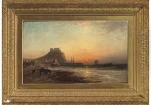 Fisherfolk On The Shore At Lowtide, A Ruined Castle Beyond.
