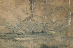 Figure At The Foot Of A Waterfall