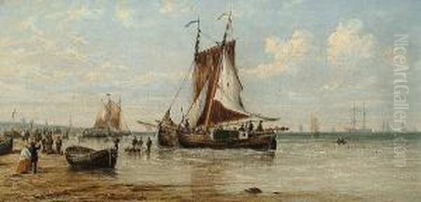 Fishing Boats At Lowtide, With Figures On The Beach