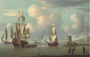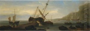 Fishermen With Their Nets On The Shoreline , A Man O' War And Other Shipping Beyond