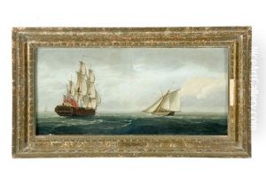 A Cutter Yacht Passing Two Frigates In A Freshening Breeze