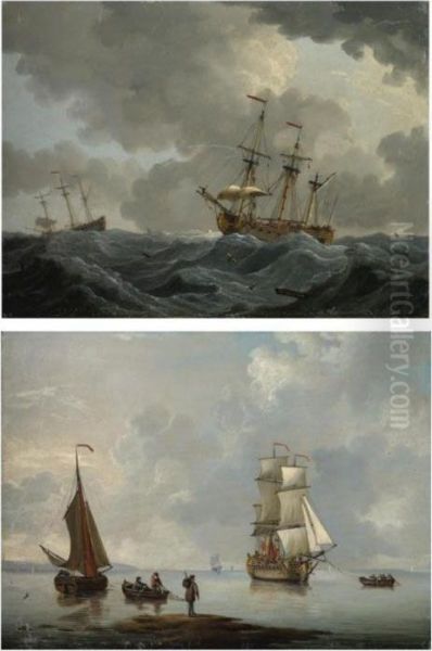 A British Man Of War Being Towed To Anchor; Two Frigates In An Approaching Storm