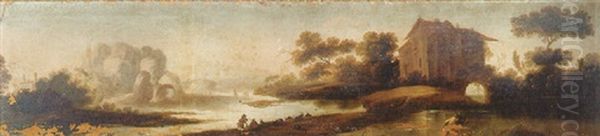 Gran Paisaje Boscoso Con Rio, Campesionos, Un Cabrero Y Una Casa