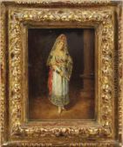 Portrait Of A Lady, Full Length, Wearing A Silk Mantilla With Apeineta, Holding A Fan, Standing Beside A Column.