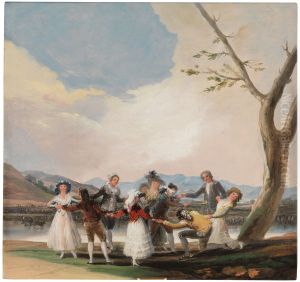 Spielende Kinder In Einer Landschaft Mit Turm Und Steinerner Bogenbrucke Unter Einem Hohen Baum