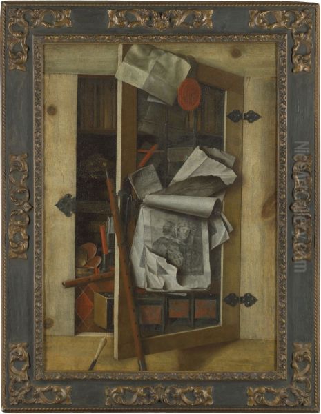 Trompe-l'oeil of an open cabinet with an engraving of Titian's Bravo and assorted objects