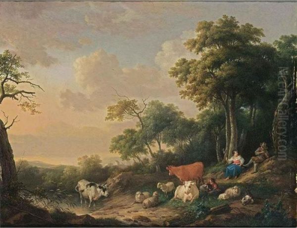 A Wooded Landscape With A Shepherd Playing A Flute And A Shepherdess Spinning Under A Tree, Their Herd Resting In The Foreground