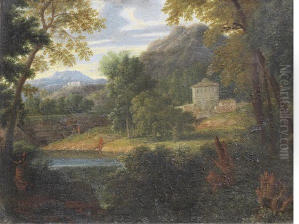 Figures By A Lake Before A Villa, A Mountainous Landscape Beyond