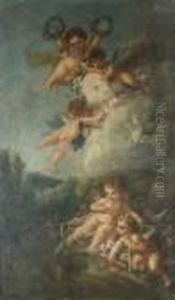Two Female Figures In Classical Dress Reclining In A Landscape Anda Putti