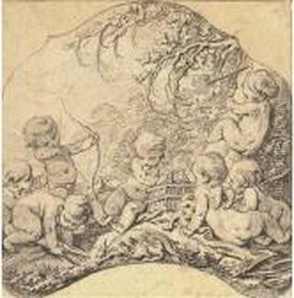 Putti Dans Un Paysage Tirant A L'arc Et Ouvrant Une Cage, Un Trophee De Chasse Au Premier Plan