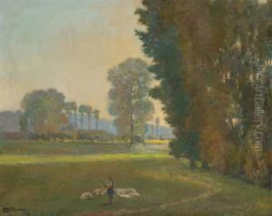 Bergere Et Son Troupeau Pres Du Cours D'eau
