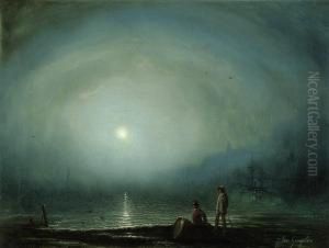 Fischer Bei Einer Alten Kate Auf Den Dunen. Mondnacht