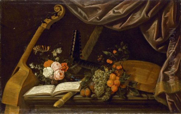 Fleurs, Fruits Et Instruments De Musique Sur Un Entablement Enpierre