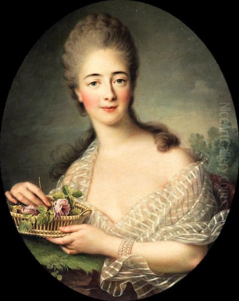 Portrait ofMadame du Barry(1743-1793) holding a woven basket of pink roses.