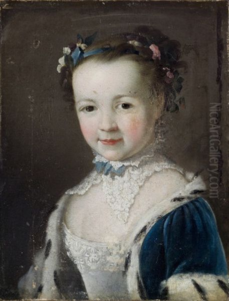 Ritratto Di Bambina A Mezzo Busto, Con Abito Azzurro Bordato D"ermellino E Fiori Tra I Capelli