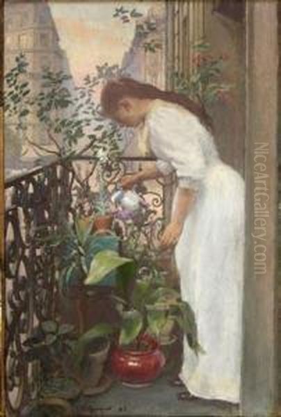 "jeune Fille Arrosant Les Fleurs"