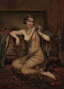 A Jewelled Ewer, Some Gold Plate, A Bracelet And A Necklace, On A Draped Ledge
