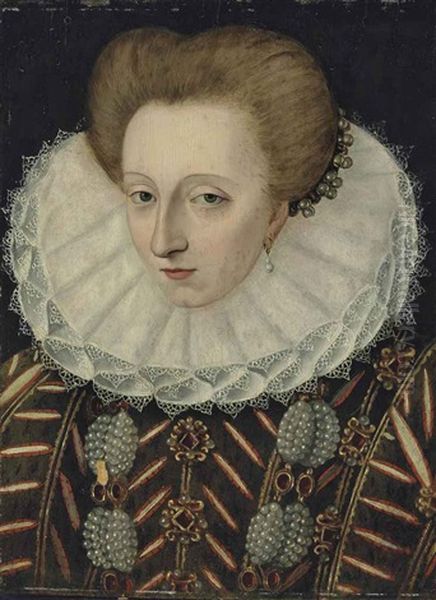Portrait Of A Woman, Bust-length, In A Green, Bejewelled, Slashed Dress And A Lace Ruff, Wearing A Pearl And Ruby Necklace And A Pearl Headdress