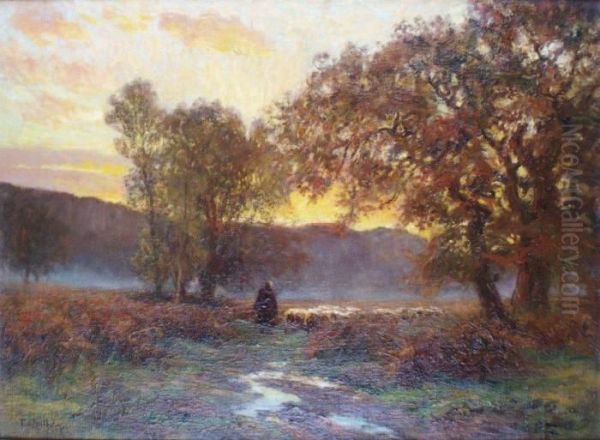 Berger Et Son Troupeau Au Soleilcouchant En Dordogne