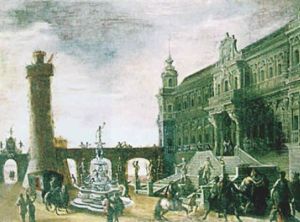 Capriccio view of an Italian piazza with a royal procession