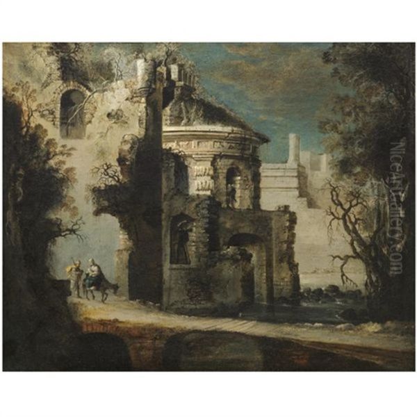 An Architectural Capriccio Of Roman Ruins With The Flight Into Egypt