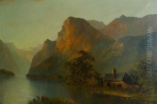 A Loch And Highland Landscape With A Cottage At Sunset
