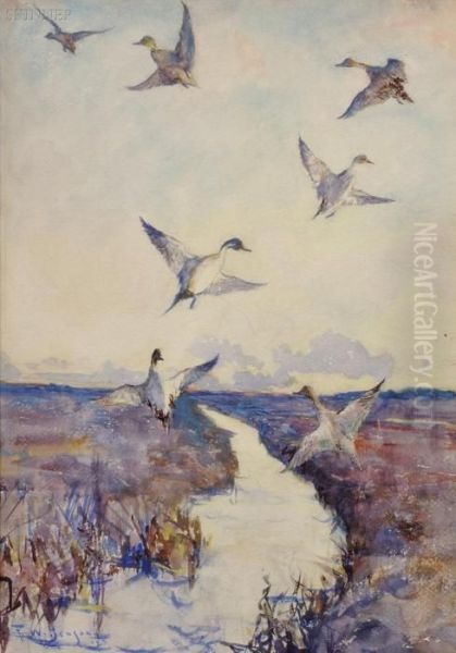Bring the timeless beauty of Frank Weston Benson's Pintails In Flight Over A Marsh into your home with a handmade oil painting reproduction. Carefully recreated on canvas by skilled artists using traditional techniques, this piece captures the delicate brushwork, subtle light, and vibrant color of the original masterpiece. With museum-level quality and rich texture, it brings elegance and artistic depth to any space. Enjoy free shipping and make this masterpiece a part of your personal collection.