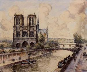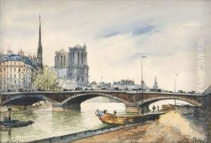 Le Pont De L'archeveche Et Notre Dame, Paris Aquarelle Sur Papier, Signee Et Situee En Bas A Droite