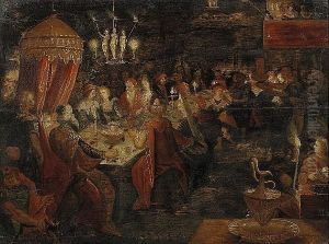 An Elegant Company Smoking And Listening To Music Around A Table, With A Scene Of The Prodigal Son In The Background