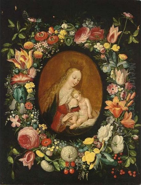 The Virgin And Child Surrounded By A Flower Garland With Roses, Tulips, Snowballs, Wallflowers, Irisses, An Opium Poppy, Pansies, Forget-me-nots, Red-turban-cup Lilies, Lilies, And Other Flowers Together With Raspberries And Red Berries