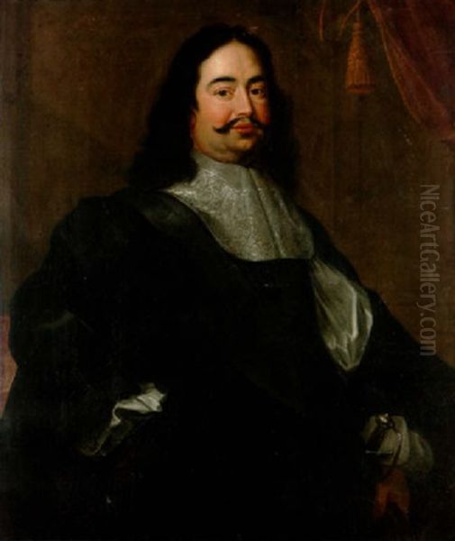 Portrait Of A Gentleman In A Black Robe With Slashed Sleeves And A White Lace Collar, Holding Gloves In His Left Hand