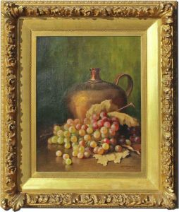 Stillleben Mit Blumenvase Und Weintrauben In Schale