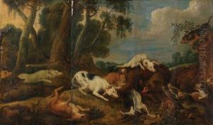 A Wild Boar Attacked By Hounds; And Wolves And Hounds Engaged In Afierce Struggle