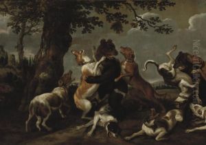 Hounds Fighting Bears In A Wooded Landscape