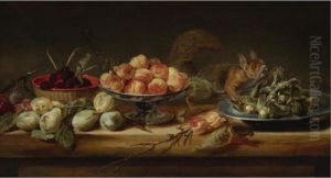 Still Life With Peaches In A Tazza, Hazelnuts On A Pewter Plate, Raspberries In A Basket, With Pears And A Squirrel On A Table