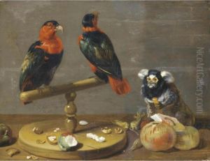 A Still Life With Two Parrots, A Marmoset, Apples, And A Variety Of Nuts On A Table