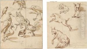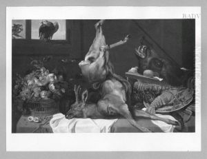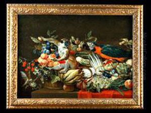 A Still Life Of Artichokes, Grapes And A Melon In A Basket, A Hung Peacock, Roe-buck And Grouse, Together With A Parrot And A Monkey, A Cat Jumping Through A Window Beyond