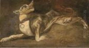A Hound Guarding Animal Lights From Other Dogs With Lemons, Anartichoke, Asparagus And Cutlery And A Monkey In A Larder