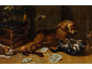 Dogs Fighting In An Interior With A Cat Nearby, A Third Dog Looking In From The Left
