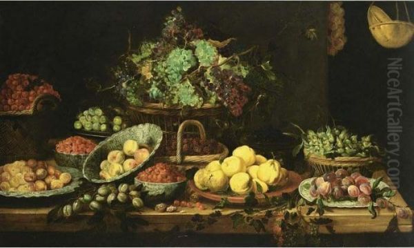 An Extensive Still Life Of Peaches, Apricots And Strawberries In Wan-li Porcelain Bowls, Quince-pears On A Stone Plate, Black Prunes On A Chinese Plate, Hazelnuts, Grapes, Blackberries And Cherries In Baskets, Berries And White Prunes In Copper Bo