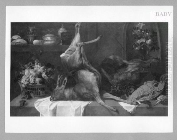 Stillleben mit Rehbock, Blumen, Fruchten und Hummer
