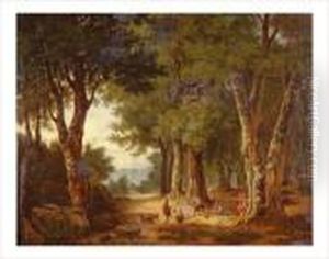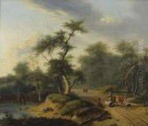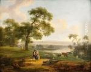 A River Landscape With A Dairymaid Milking Cows, Together With Other Figures, A Town Beyond