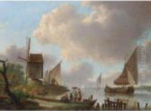"riverlandscapewith Sailing Boats, Right In The Front A Fisherman And Twotravellers. At The Left A Small Boat With A Fisherman Catching Eeland A Town At The Horizon