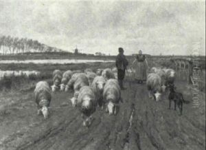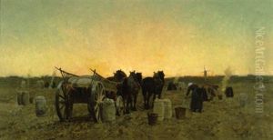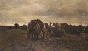 Feldweg Mit Jungen Bauern Auf Einem Pferdefuhrwerk, Im Hintergrund Zwei Bauernmagde