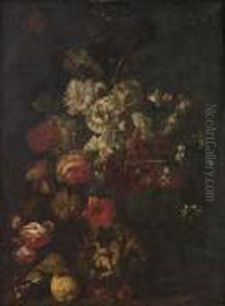 Roses, Carnations, Peonies And Other Flowersin An Antique Urn, On A Table Top, With A Lemon And Prunes